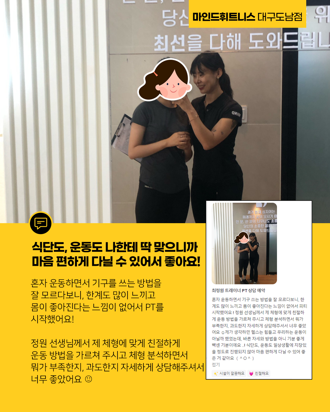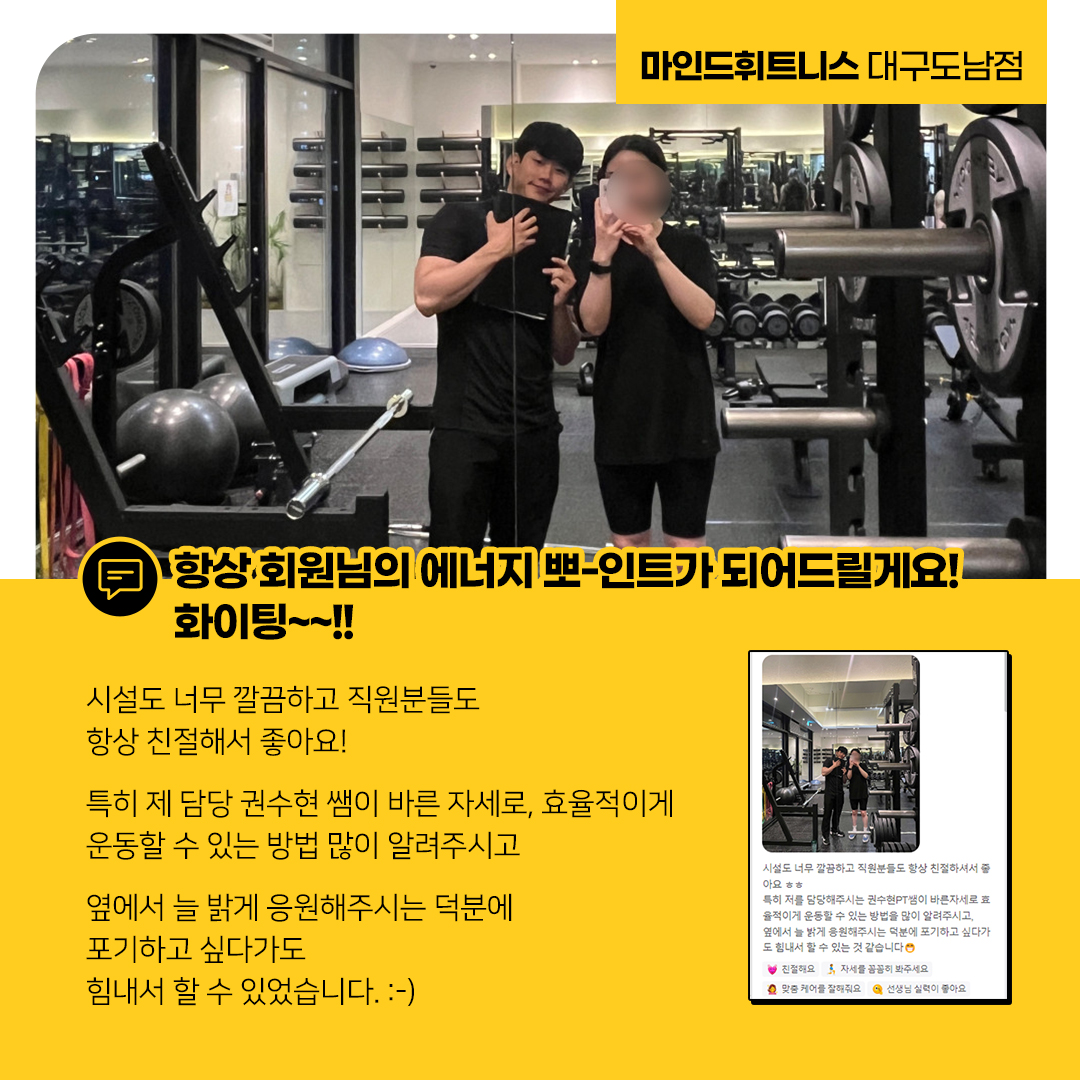 마음이 진심이 되어 전심이 되는 휘트니스, 질 좋은 운동 · 제대로 된 운동효과를 마인드휘트니스 대구 도남지구점에서 얻어 보시는 건 어떠신가요? |