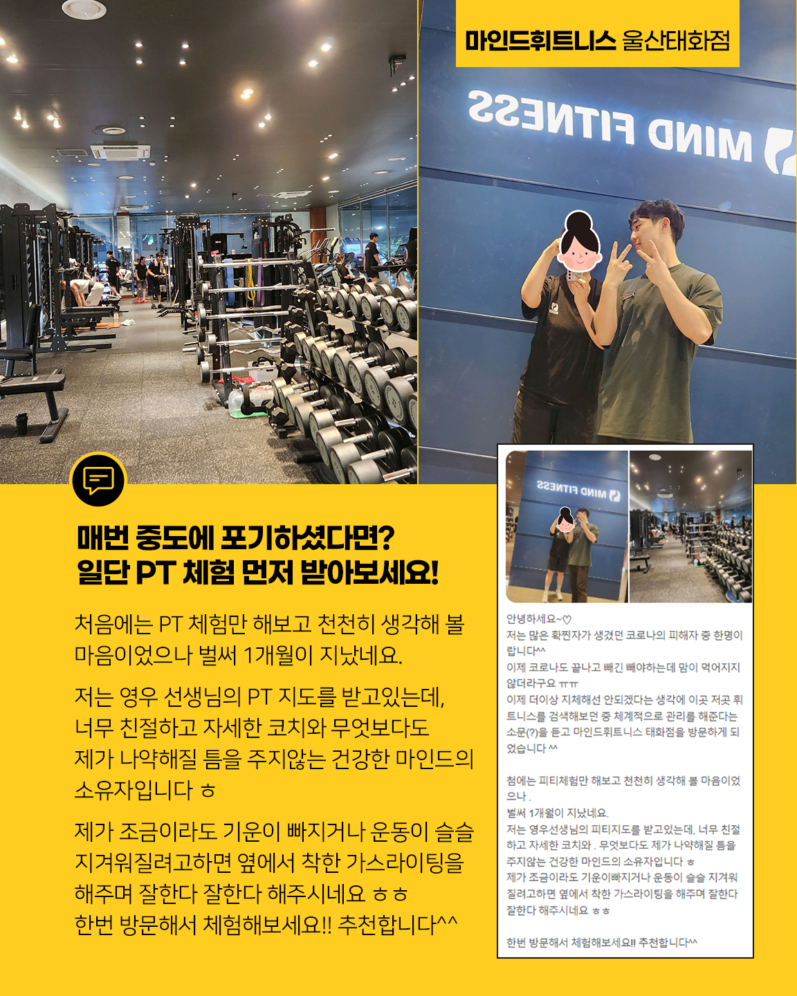 마음이 진심이 되어 전심이 되는 휘트니스, 질 좋은 운동 · 제대로 된 운동효과를 마인드휘트니스 울산태화점에서 얻어 보시는 건 어떠신가요? |